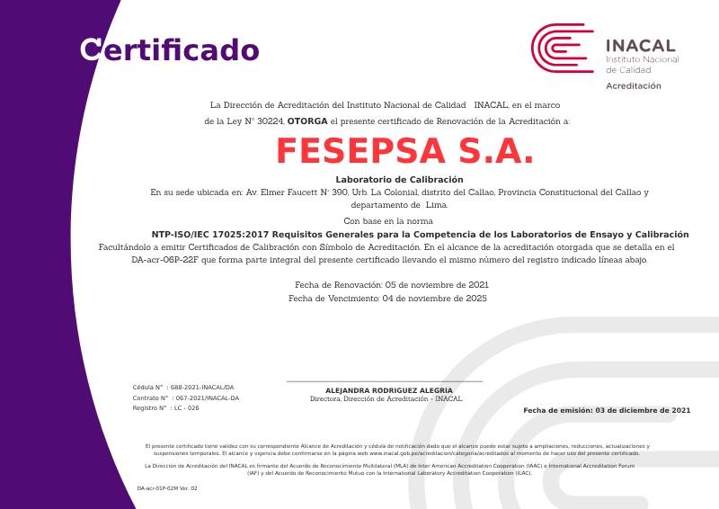 Nuestro laboratorio está acreditado por INACAL bajo la norma ISO/IEC 17025 (código LC-026), garantizando la trazabilidad y precisión en nuestros servicios.